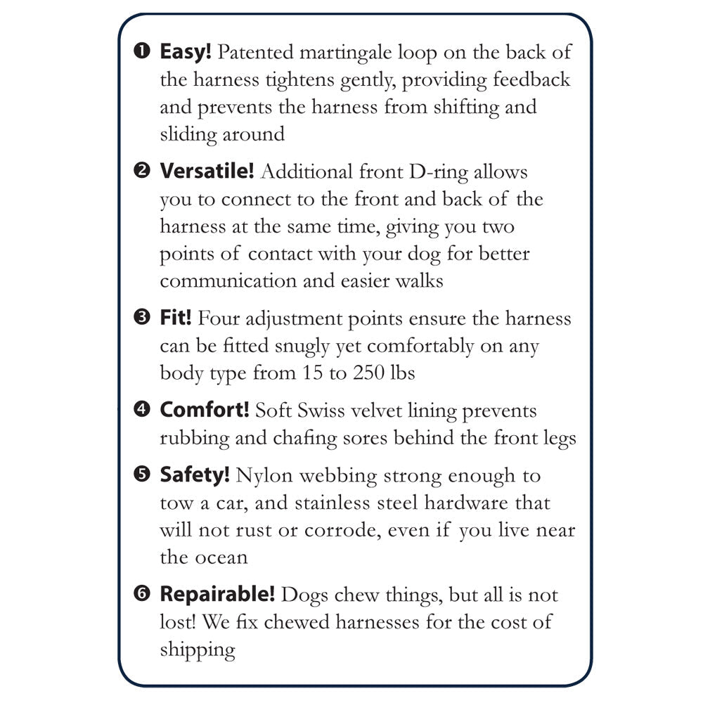 - Swiss Velvet Lining on the strap that goes behind the legs helps prevent rubbing, chaffing and sores that are sometimes seen with other harness designs.