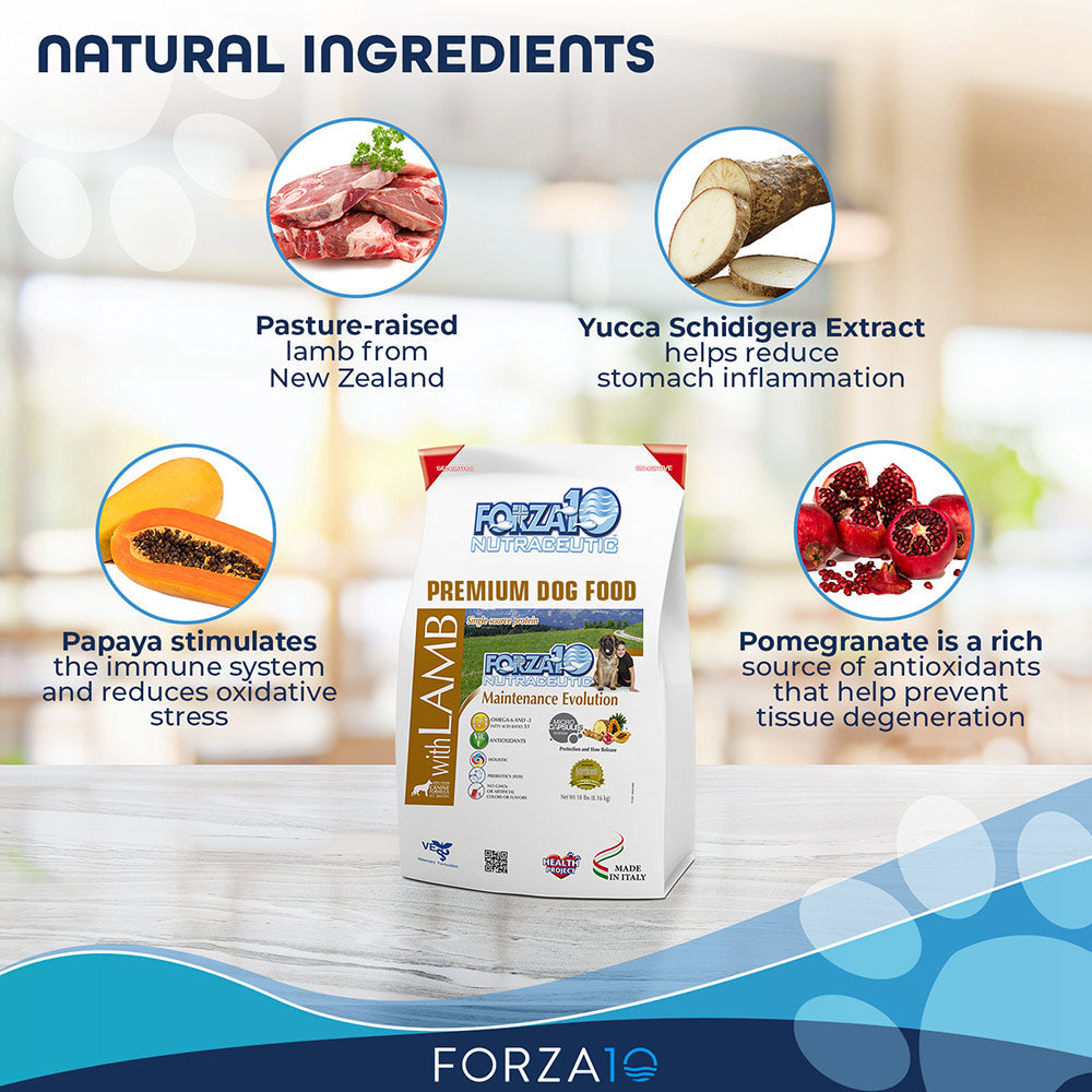 Forza10 Active Maintenance Evolution is a complete and balanced recipe designed as an everyday dog food for overall health and wellness in all life stages. Made with delicious pasture-raised New Zealand Lamb, which is a premium source of essential amino acids and vitamins. The recipe is also made with therapeutic plants and fruit extracts like papaya, pomegranate, and rosemary extract, which are great for any dog with allergies and to achieve an optimal health condition.